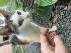 とにかく声がおおきく、ごはんへのアピール力は半端ない。ほかのオス猫の間をかいくぐって、近所の住み家からやってくる若手のホープ。