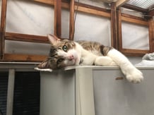 前足に大きな傷をもって、いつのころからか住み着いたオス猫。ジャンプ力もあまりない老猫だが、長年培った貫禄で他の猫たちを圧倒し、ボス猫として君臨中。人に爪を立てないので、お客様には一番可愛がられている。